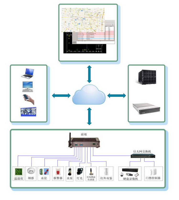 子系統(tǒng)主要包括:環(huán)境監(jiān)測(cè)系統(tǒng)、無線設(shè)備測(cè)溫系統(tǒng)、煙火監(jiān)測(cè)系統(tǒng)、門磁監(jiān)測(cè)系統(tǒng)、入侵監(jiān)測(cè)系統(tǒng)、水浸監(jiān)測(cè)系統(tǒng)、視頻監(jiān)控系統(tǒng)。